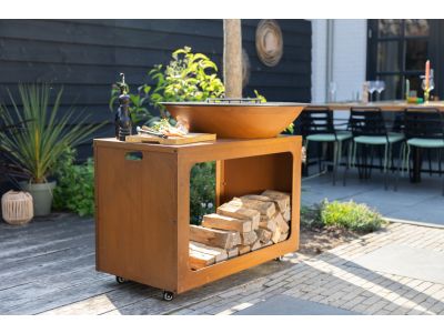 Wat deze vuurschaal uniek maakt, zijn de twee regelbare luchttoevoeren. Hiermee bepaal je zelf de hoeveelheid zuurstof die het vuur krijgt. Meer zuurstof zorgt voor een heter vuur met meer vlammen en minder rook, ideaal voor het bakken op hoge temperatuur. Minder zuurstof laat het vuur smeulen en houdt de temperatuur stabiel. Het meubel wordt standaard zonder wielen geleverd, maar deze zijn optioneel verkrijgbaar om de unit eenvoudig te verplaatsen. Je krijgt 5 jaar garantie op de constructie en de bakplaat.