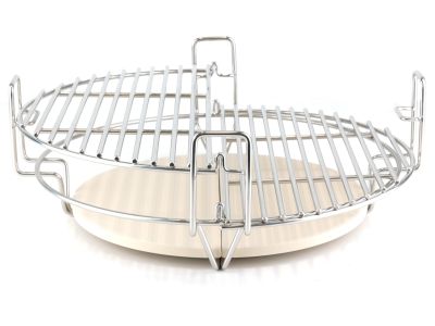 Met het BASTE Multilevel cooking system haal je meer flexibiliteit en controle uit jouw 18 inch kamado. Dit accessoire bestaat uit een stevig roestvrijstalen frame en een tweedelige keramische heat deflector. De deflector plaats je tussen het vuur en je rooster, waardoor de directe hitte wordt geblokkeerd. Zo verandert je kamado in een heteluchtoven, ideaal voor het langzaam en op lage temperatuur garen van grote stukken vlees.