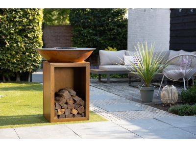 Het ontwerp is gericht op gebruiksgemak. Zo beschikt het vierkante onderstel over een ingebouwde opslagruimte voor je haardhout, zodat je dit altijd bij de hand hebt. Na het gebruik maak je de vuurschaal eenvoudig schoon dankzij de uitneembare aslade. Een slimme ring aan de binnenzijde van de bakplaat voorkomt bovendien dat je eten per ongeluk in het vuur terechtkomt.