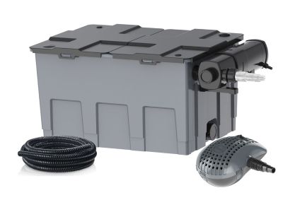 De Heissner FPU 24000-00 is een complete filterset, ontworpen om het water in je vijver helder en gezond te houden. De set bestaat uit een doorstroomfilter, een aparte UV-C unit en een regelbare vijverpomp. De combinatie van mechanische filtering door sponzen en de UV-C lamp pakt zowel vuildeeltjes als de zweefalgen die groen water veroorzaken effectief aan.