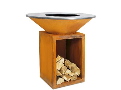 De vierkante sokkel biedt een stabiele basis en dient tevens als handige opslag voor je haardhout. Bovenop de sokkel rust de vuurschaal met een brede, ronde kookplaat van zwart staal. De totale hoogte komt hiermee op 100 cm, een comfortabele werkhoogte om aan te staan. Het kookoppervlak heeft een diameter van 100 cm en geleidt de warmte goed, waardoor je gemakkelijk voor grotere groepen kunt koken.