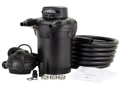 De Pontec PondoPress 5000 is een complete filterset die geschikt is voor kleinere vijvers tot 5.000 liter zonder vis, of tot 2.500 liter met vis. De set bestaat uit een drukfilter, een UV-C unit, een pomp met een capaciteit van 1.500 liter per uur, en een slang van 4,5 meter. Dankzij het gesloten systeem en de mogelijkheid om de filter deels in te graven, werk je het geheel netjes weg in de tuin.