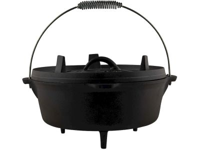 Deze Dutch Oven is voorzien van pootjes onder de pan en op de deksel. De pootjes onder de pan zorgen voor een stabiele plaatsing direct op hete kolen of in een vuurschaal. De deksel heeft een opstaande rand, zodat briketten die je erop legt voor bovenwarmte er niet afvallen. Je kunt de deksel ook omgekeerd gebruiken als bakplaat of skillet, waarbij de pootjes als standaard dienen. Dit multifunctionele ontwerp maakt het zelfs mogelijk om meerdere pannen efficiënt op elkaar te stapelen.