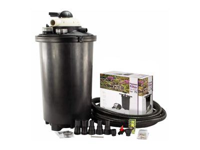 De Velda Clear Control 75 is een complete filtersysteemset voor vijvers. Deze set bestaat uit een drukfilter, energiezuinige vijverpomp, UV-C unit en alle benodigde aansluitmaterialen. Het systeem is geschikt voor vijvers tot 30.000 liter zonder vis, 15.000 liter met vis en 7.500 liter bij koibezetting. Dankzij de volledige samenstelling kun je direct aan de slag met het zuiveren van je vijverwater.