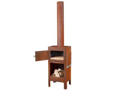 De oven heeft een slimme, dubbelwandige constructie. Dit ontwerp zorgt ervoor dat de rook via de schoorsteen wordt afgevoerd en niet in contact komt met je eten. Hierdoor geniet je van een pure smaak en heb je minder last van rook die uit de opening aan de voorkant komt. Wanneer je klaar bent met koken, functioneert de oven als een sfeervolle tuinhaard die prettige warmte afgeeft.